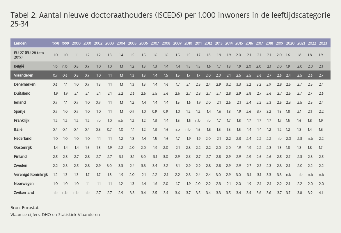 Tabel 2. Aantal nieuwe doctoraathouders (ISCED6) per 1.000 inwoners in de leeftijdscategorie 25-34